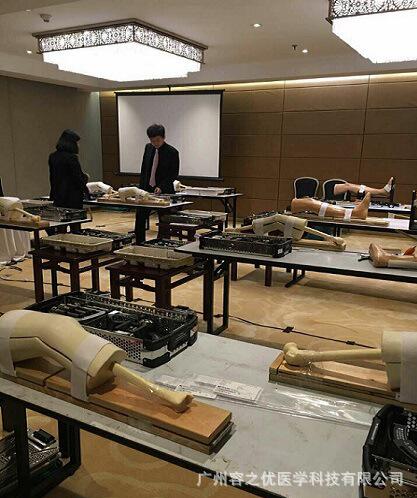 nuestro socio cooperativo hace la práctica de entrenamiento con nuestro fémur y tibia ósea simulados.